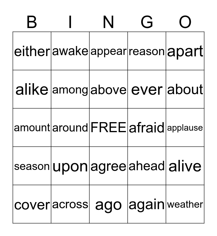This bingo card has a free space and 24 words: upon, across, above, cover, apart, either, alike, awake, afraid, agree, ever, amount, ahead, alive, among, again, applause, appear, about, around, weather, season, reason and ago.
