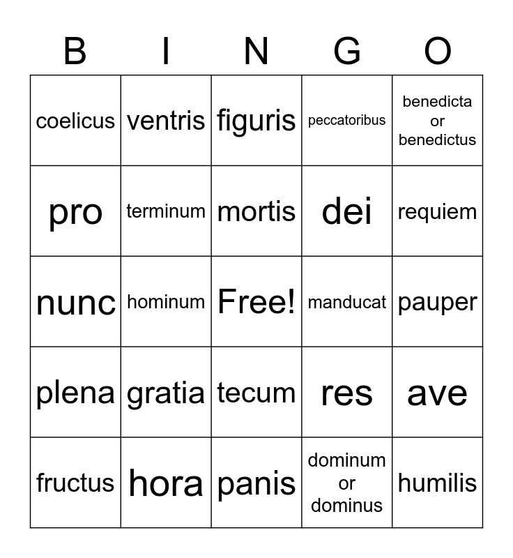 This bingo card has a free space and 31 words: panis, fit, hominum, dat, coelicus, figuris, terminum, res, manducat, dominum or dominus, pauper, humilis, pie, dona, requiem, sempiternam, ave, gratia, plena, tecum, benedicta or benedictus, mulieribus, fructus, ventris, dei, pro, peccatoribus, nunc, hora, mortis and nostrae.
