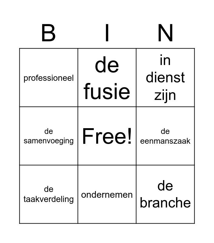 This bingo card has a free space and 12 words: de administratie, de beroepstak, de branche, de eenmanszaak, de fusie, in dienst zijn, ondernemen, de overname, professioneel, de samenvoeging, de taakverdeling and zakelijk.