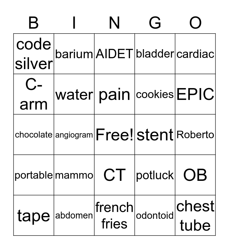 This bingo card has a free space and 24 words: mammo, abdomen, pain, tape, cardiac, code silver, C-arm, barium, stent, CT, cookies, chocolate, potluck, OB, water, odontoid, Roberto, AIDET, EPIC, angiogram, chest tube, portable, bladder and french fries.