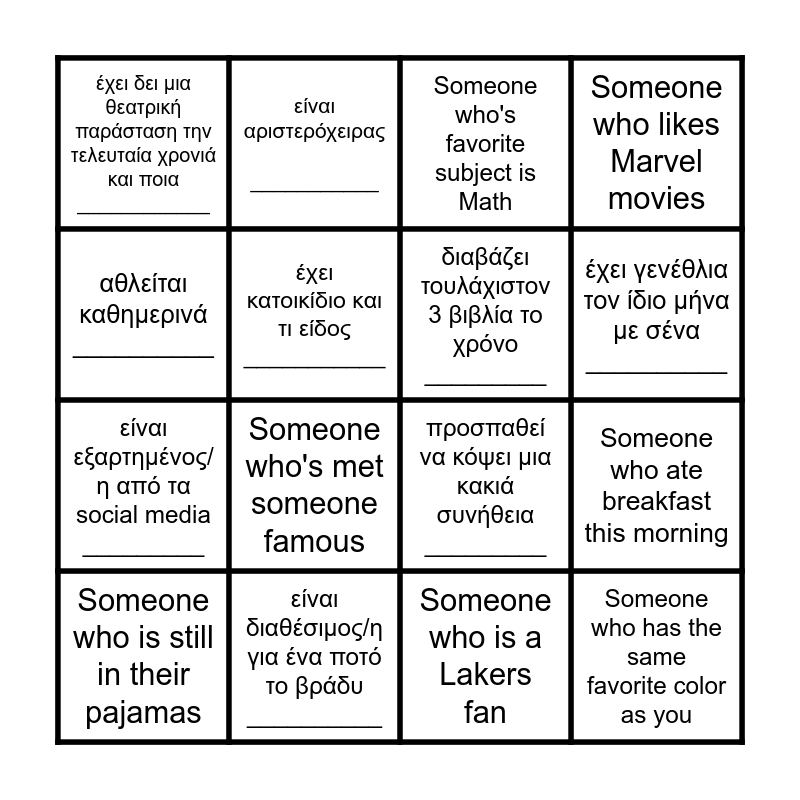 This bingo card has 25 words: έχει αδέλφια ________ Τι γένους; _________ __________, έχει ταξιδέψει τα τελευταία πέντε χρόνια στο εξωτερικό ____________, έχει γενέθλια τον ίδιο μήνα με σένα __________, λατρεύει τις τηγανιτές πατάτες _________, αθλείται καθημερινά __________, έχει δει μια θεατρική παράσταση την τελευταία χρονιά και ποια ____________, έχει κατοικίδιο και τι είδος ___________, είναι αριστερόχειρας ___________, είναι διαθέσιμος/η για ένα ποτό το βράδυ __________, του/της αρέσει το πρωινό ξύπνημα ________, είναι εξαρτημένος/η από τα social media _________, προσπαθεί να κόψει μια κακιά συνήθεια _________, είναι μοναχοπαίδι _________, φοβάται τα έρπετά ________, διαβάζει τουλάχιστον 3 βιβλία το χρόνο _________, του/της αρέσει να χορεύει ________, Someone who is a Lakers fan, Someone who's favorite subject is Math, Someone who's met someone famous, Someone who ate breakfast this morning, Someone who is still in their pajamas, Someone who can sing or rap, Someone who has the same favorite color as you, Someone who likes Marvel movies and Someone who is an only child.
