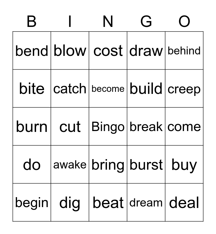 This bingo card has a free space and 25 words: awake, beat, become, begin, behind, bend, bite, blow, break, bring, build, burn, burst, buy, catch, choose, come, cost, creep, cut, deal, dig, do, draw and dream.