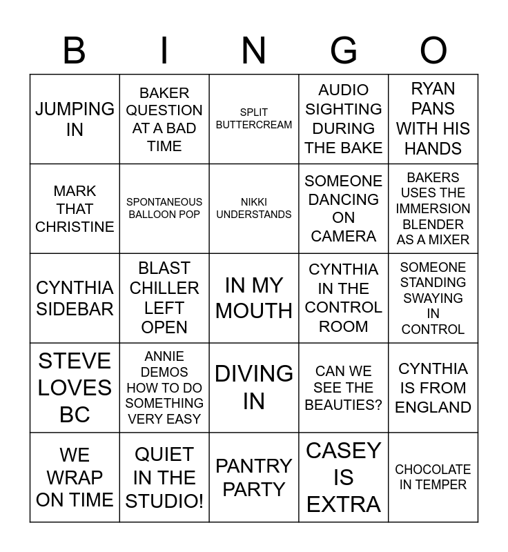 This bingo card has a free space and 76 words: NAT ZINGER, TOOK THE WORDS OUT OF MY HEAD, SPLIT BUTTERCREAM, SOMEBODY BURNS SOMETHING, CRYSTALLIZED CARAMEL, OLSON SAVES THE DAY, MIC DROPPED, MOM & DAD ARGUE, KAI IS TOO LOUD, CHAR IS DEAD, BILLY SIGHTING, KELLY SIGHTING, NIKKI UNDERSTANDS, MARK THAT CHRISTINE, MESS ON THE FLOOR, BLAST CHILLER LEFT OPEN, HODGE NOT PAYING ATTENTION, CHOCOLATE IN TEMPER, CHOCOLATE NOT IN TEMPER, RYAN PANS WITH HIS HANDS, JUDGE DOESN’T HAVE IFB, CYNTHIA SIDEBAR, SPONTANEOUS BALLOON POP, BAKER QUESTION AT A BAD TIME, AUDIO SIGHTING DURING THE BAKE, DUTCH PROCESSED COCOA SIGHTING, JEN DANCES, ANNIE FIXES HAIR, ANNIE FIXES WARDROBE, LATICE IS COOL, CONTINUITY GONG, WHERE’S THE APPLEBOX?, BAKER WORKING ON THE BACK STATION, CAN WE SEE THE BEAUTIES?, BAKERS USES THE IMMERSION BLENDER AS A MIXER, SOMEONE DANCING ON CAMERA, ANNE CAN’T FIND (name) ON COMS, JEN GIVES A HEART, SOMEONE STANDING SWAYING IN CONTROL, CASEY IS EXTRA, BLOW TORCH USED, BAKERS HIGH FIVE, SARAH YELLS AT BAKERS, TURN THE LABELS, MIX FIC AS WE’RE SHOOTING, WE WRAP LATE, WE WRAP ON TIME, JUMPING IN, STATIC ON HEADSET, NAT FUN FACT, J&N SING, DIVING IN, PART THE RED SEA, MAILE IS CUTE, ANNIE IS NOT PLEASED, BAKERS NEED ENERGY, WE NEED A LUKEY, STAGE HAND SIGHTING, I SEOND THAT EMOTION, RYAN FARM STORY, ANNIE DEMOS HOW TO DO SOMETHING VERY EASY, WE'VE GOT TO GO, ANNA VISITS CONTROL ROOM, UNDER BAKED CAKE, ASSISTANTS NEED TO SETTLE DOWN, HODGE IN THE CONTROL ROM, CYNTHIA IN THE CONTROL ROOM, EYELINE IS OFF, NEED MORE MIXING BOWLS, STEVE SMOLDERS, CYNTHIA IS FROM ENGLAND, STEVE LOVES BC, QUIET IN THE STUDIO!, RYAN WHISTLES IN HEADSET, PANTRY PARTY and BAKERS ARE TOO SLOW.