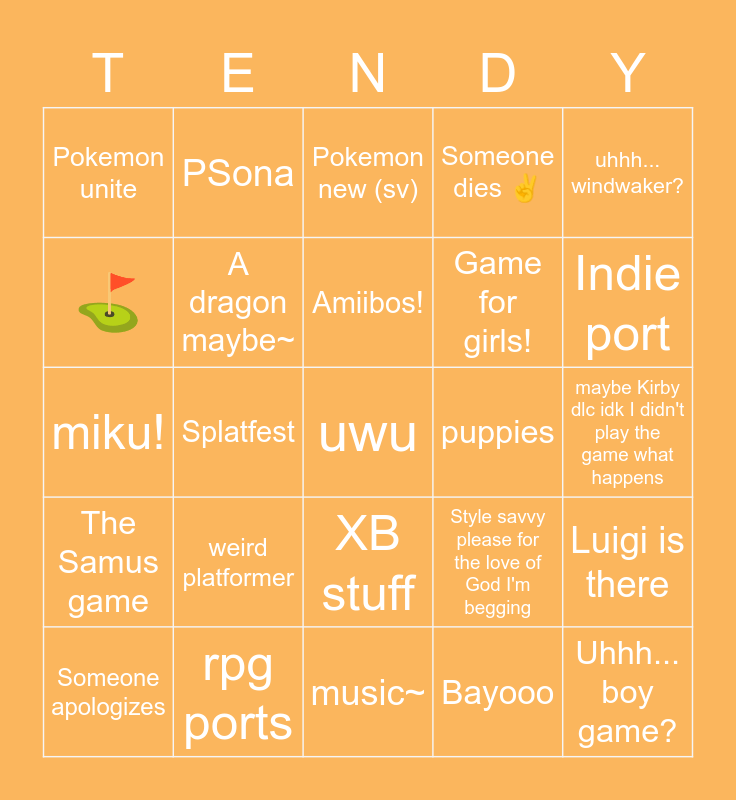 This bingo card has a free space and 24 words: weird platformer, rpg ports, Amiibos!, Someone apologizes, uhhh... windwaker?, Pokemon unite, ⛳️, PSona, puppies, XB stuff, Game for girls!, miku!, Style savvy please for the love of God I'm begging, Luigi is there, A dragon maybe~, Bayooo, maybe Kirby dlc idk I didn't play the game what happens, Pokemon new (sv), Indie port, Splatfest, Uhhh... boy game?, The Samus game, Someone dies ✌️ and music~.