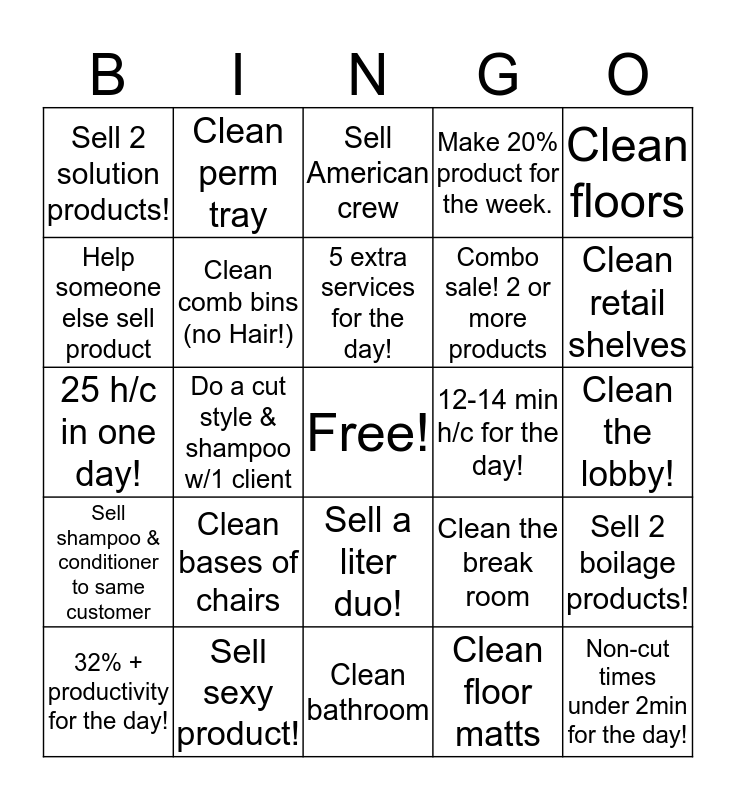 This bingo card has a free space and 24 words: Clean bases of chairs, Sell sexy product!, 5 extra services for the day!, 32% + productivity for the day!, Clean floors, Sell 2 solution products!, Help someone else sell product, Clean perm tray, 12-14 min h/c for the day!, Sell a liter duo!, Combo sale! 2 or more products, 25 h/c in one day!, Clean the break room, Sell 2 boilage products!, Clean comb bins (no Hair!), Clean floor matts, Clean the lobby!, Sell American crew, Clean retail shelves, Do a cut style & shampoo w/1 client, Non-cut times under 2min for the day!, Sell shampoo & conditioner to same customer, Make 20% product for the week. and Clean bathroom.