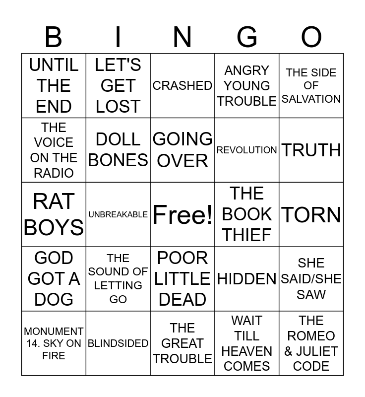 This bingo card has a free space and 24 words: THE SOUND OF LETTING GO, BLINDSIDED, GOING OVER, MONUMENT 14. SKY ON FIRE, THE SIDE OF SALVATION, UNTIL THE END, THE VOICE ON THE RADIO, LET'S GET LOST, THE BOOK THIEF, POOR LITTLE DEAD, REVOLUTION, RAT BOYS, HIDDEN, SHE SAID/SHE SAW, DOLL BONES, WAIT TILL HEAVEN COMES, TORN, CRASHED, TRUTH, UNBREAKABLE, THE ROMEO & JULIET CODE, GOD GOT A DOG, ANGRY YOUNG TROUBLE and THE GREAT TROUBLE.