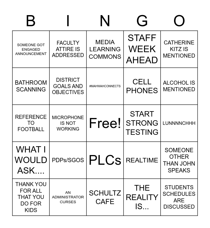 This bingo card has a free space and 34 words: UMMKAY, THE REALITY IS..., MINDFUL/ MINDFULLNESS, SOCIAL AND EMOTIONAL LEARNING, WHAT I WOULD ASK...., DISTRICT GOALS AND OBJECTIVES, CATHERINE KITZ IS MENTIONED, THANK YOU FOR ALL THAT YOU DO FOR KIDS, FACULTY ATTIRE IS ADDRESSED, BUILDING BRIDGES, #MAHWAHCONNECTS, MEDIA LEARNING COMMONS, THUNDERBIRD THURSDAY, GOVERNOR MURPHY, START STRONG TESTING, ALCOHOL IS MENTIONED, AN ADMINISTRATOR CURSES, REFERENCE TO FOOTBALL, PDPs/SGOS, REALTIME, PLCs, CANVAS, SOMEONE GOT ENGAGED ANNOUNCEMENT, LUNNNNCHHH, SCHULTZ CAFE, STUDENTS SCHEDULES ARE DISCUSSED, STAFF WEEK AHEAD, TIERED SYSTEMS OF SUPPORT, CELL PHONES, BATHROOM SCANNING, IEP/504, MICROPHONE IS NOT WORKING, SOMEONE OTHER THAN JOHN SPEAKS and BACK TO SCHOOL NIGHT.