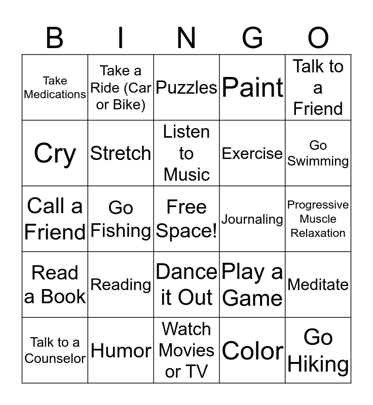 This bingo card has a free space and 24 words: Reading, Humor, Listen to Music, Talk to a Counselor, Talk to a Friend, Take Medications, Cry, Take a Ride (Car or Bike), Journaling, Dance it Out, Exercise, Call a Friend, Play a Game, Meditate, Stretch, Color, Progressive Muscle Relaxation, Puzzles, Go Swimming, Go Fishing, Go Hiking, Read a Book, Paint and Watch Movies or TV.