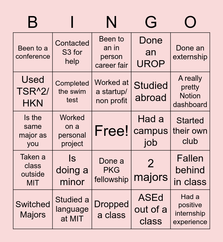 This bingo card has a free space and 27 words: 2 majors, Had a negative internship experience, Studied abroad, Dropped a class, Used TSR^2/ HKN, Been to an in person career fair, Contacted S3 for help, Taken a class outside MIT, Had a campus job, Fallen behind in class, Is the same major as you, Done an UROP, Switched Majors, Studied a language at MIT, A really pretty Notion dashboard, Failed a PE class, Completed the swim test, Worked at a startup/ non profit, Is doing a minor, Been to a conference, Started their own club, ASEd out of a class, Worked on a personal project, Had a positive internship experience, Done a PKG fellowship, Done an externship and Negotiated job offers.