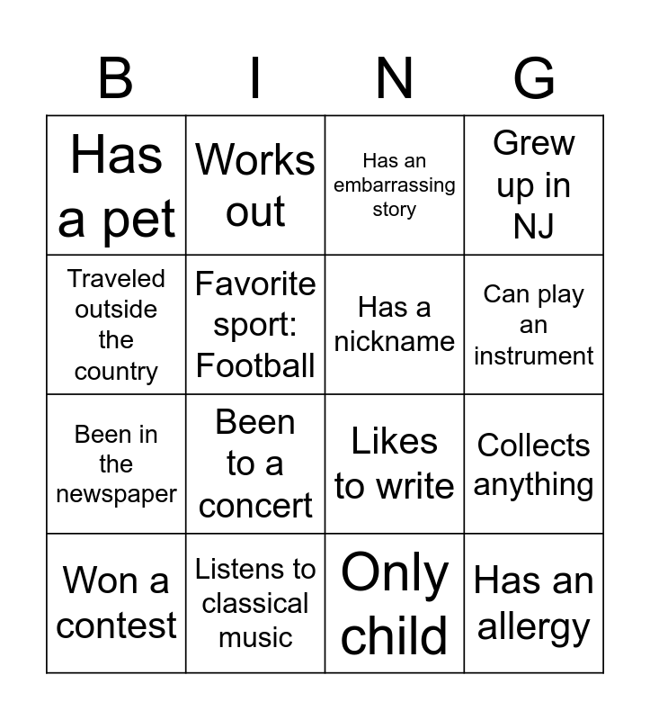 This bingo card has 32 words: Been to a sports game, Read a book this year, Collects anything, Favorite sport: Soccer, Has an allergy, Has a nickname, Traveled outside the country, Been to the zoo, Works out, Watched The Office, Can play an instrument, Has an embarrassing story, Can swim, Has a favorite movie, Listens to classical music, Can whistle, Likes camping, Likes to write, Played on a sports team, Can dance, Puts cereal before milk, Can sing, Only child, Believe in ghosts, Won a contest, Grew up in NJ, Been in the newspaper, Favorite sport: Football, Has a pet, Had a celebrity crush, Likes pineapple on pizza and Been to a concert.