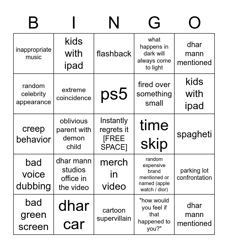 This bingo card has a free space and 32 words: "how would you feel if that happened to you?", child with unrealistic emotional maturity, oblivious parent with demon child, continuity error, bad voice dubbing, extreme coincidence, dhar mann mentioned, parking lot confrontation, kids with ipad, "you see" / "so you see", ps5, flashback, someone fired over something small, unreasonable mom, calm dad, time skip, bad props, bad green screen, creep behavior, merch in video, dhar mann studios office in the video, random expensive brand mentioned or named (apple watch / dior), sexism, spagheti, dhar car, dhar mann mentioned, what happens in dark will always come to light, fired over something small, random celebrity appearance, inappropriate music, cartoon supervillain, someone gets evicted and kids with ipad.