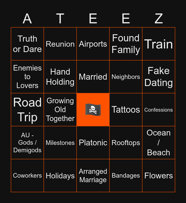 This bingo card has a free space and 98 words: Angst, Banter, Character Study, Confessions, Domesticity, Drinking Games, Feelings Realization, Flirting, Fluff, Forced Proximity, Happy Ending, Hurt / Comfort, Meet Cute, Milestones, Questioning Sexuality, Reunion, Road Trip, Rumors / Gossip, Running Away, Secret Admirer, Secrets, Sharing a Bed, Slice of Life, Snowed In, Third Wheel, Truth or Dare, Arranged Marriage, Best Friends, Best Friend’s Brother, Childhood Friends, Coworkers, Enemies to Lovers, Established Relationship, Exes, Fake Dating, First Date, Found Family, Friends with Benefits, Growing Old Together, High School Sweethearts, Long Distance, Married, Neighbors, Oblivious Idiots, Pining, Platonic, Poly Ship, Rivals, Roommates, Soulmates, Starcrossed, Sugar Daddy / Sugar Baby, Teammates, AU - Angels / Demons, AU - College, AU - Criminals, AU - Gods / Demigods, AU - Magical Realism, AU - Medical Professionals, AU - Mermaids, AU - Omegaverse, AU - Outer Space, AU - Pirates, AU - Reality Show, AU - Reincarnation, AU - Royalty, AU - Sports, AU - Tattoo Parlor / Flower Shop, AU - Video Game Crossover, 5 + 1, Airports, Anniversary, Bandages, Bars / Restaurants, Bubble Baths, Concerts, Convenience Stores, Countryside, Fireworks, Flowers, Food / Cooking, Hand Holding, Holidays, Kissing, Lollipops, Love Languages, Makeup, Neon Lights, Ocean / Beach, Pets / Animals, Piercings, Rooftops, Scars, Snow Storms / Blizzards, Tattoos, Thunder / Rain Storms, Train and Weddings.