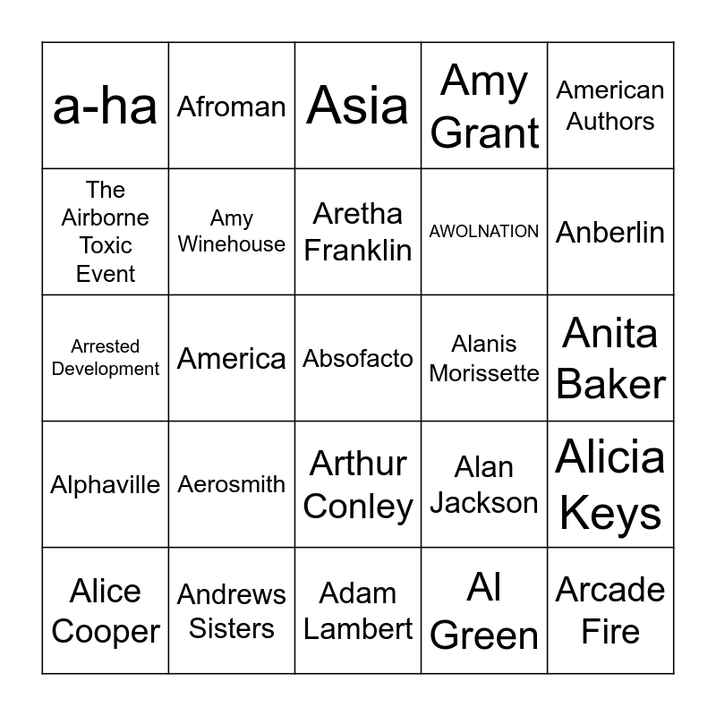 This bingo card has 49 words: Aaliyah, Absofacto, Ace of Base, Adam Lambert, Aerosmith, AFI, Afroman, Air Supply, The Airborne Toxic Event, AJR, Amy Winehouse, Amy Grant, Alicia Keys, Alan Jackson, Avenged Sevenfold, Allman Brothers Band, Aretha Franklin, Alanis Morissette, Audioslave, American Authors, America, Al Green, a-ha, AWOLNATION, Alabama Shakes, Anberlin, Alice Cooper, Andrew Bird, Arthur Conley, Alphaville, alt-J, Amerie, Andrea Bocelli, Andrea True Connection, Andrews Sisters, Andrew McMahon and the Wilderness, Angels & Airwaves, The Animals, Anita Baker, Annie Lennox, apl.de.ap, Aqua, Arcade Fire, The Archies, Arrested Development, Asia, Avril Lavigne, Annette Funicello and Ambrosia.