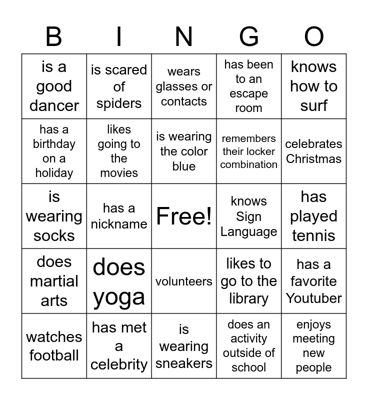This bingo card has a free space and 24 words: does yoga, has met a celebrity, is wearing the color blue, watches football, knows how to surf, is a good dancer, has a birthday on a holiday, is scared of spiders, knows Sign Language, volunteers, remembers their locker combination, is wearing socks, likes to go to the library, has a favorite Youtuber, likes going to the movies, does an activity outside of school, has played tennis, wears glasses or contacts, celebrates Christmas, has a nickname, enjoys meeting new people, does martial arts, has been to an escape room and is wearing sneakers.