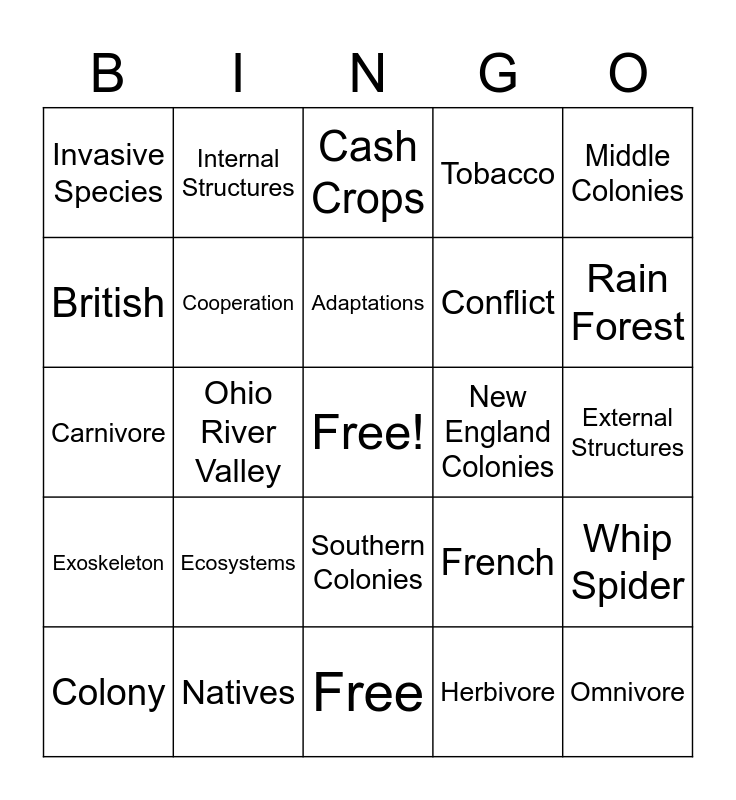 This bingo card has a free space and 24 words: Ecosystems, Natives, Adaptations, Colony, Middle Colonies, Invasive Species, British, Internal Structures, New England Colonies, Southern Colonies, Conflict, Carnivore, French, Whip Spider, Cooperation, Herbivore, External Structures, Cash Crops, Rain Forest, Ohio River Valley, Omnivore, Exoskeleton, Tobacco and Free.