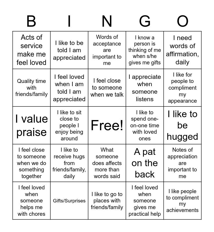 This bingo card has a free space and 24 words: I like to receive hugs from friends/family, daily, Gifts/Surprises, I feel close to someone when we talk, I feel loved when someone helps me with chores, I need words of affirmation, daily, Acts of service make me feel loved, Quality time with friends/family, I like to be told I am appreciated, I like to spend one-on-one time with loved ones, What someone does affects more than words said, I appreciate when someone listens, I value praise, A pat on the back, Notes of appreciation are important to me, I feel loved when I am told I am appreciated, I feel loved when someone gives me practical help, I like to be hugged, Words of acceptance are important to me, I like for people to compliment my appearance, I like to sit close to people I enjoy being around, I like people to compliment my achievements, I feel close to someone when we do something together, I know a person is thinking of me when s/he gives me gifts and I like to go to places with friends/family.