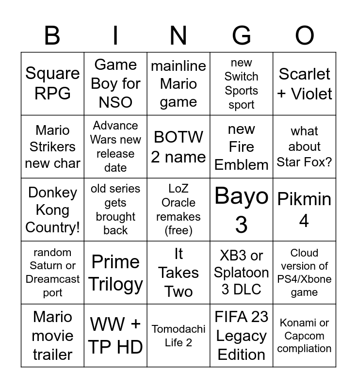 This bingo card has a free space and 24 words: Prime Trilogy, WW + TP HD, BOTW 2 name, Mario movie trailer, Scarlet + Violet, Square RPG, Mario Strikers new char, Game Boy for NSO, Bayo 3, It Takes Two, new Fire Emblem, Donkey Kong Country!, XB3 or Splatoon 3 DLC, Cloud version of PS4/Xbone game, Advance Wars new release date, FIFA 23 Legacy Edition, Pikmin 4, mainline Mario game, what about Star Fox?, old series gets brought back, Konami or Capcom compliation, random Saturn or Dreamcast port, new Switch Sports sport and Tomodachi Life 2.
