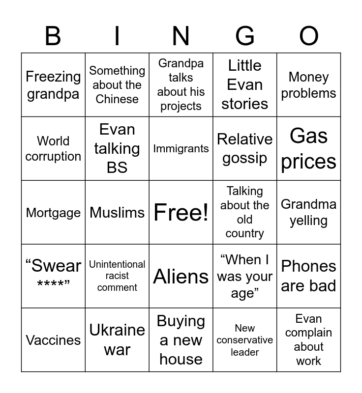 This bingo card has a free space and 26 words: Aliens, New conservative leader, Immigrants, Ukraine war, Money problems, Freezing grandpa, World corruption, Something about the Chinese, Grandma yelling, “When I was your age”, Relative gossip, Mortgage, Phones are bad, Vaccines, Muslims, Grandpa tells a crazy story, Little Evan stories, “Swear ****”, Grandpa talks about his projects, Evan complain about work, Gas prices, Buying a new house, Talking about the old country, Unintentional racist comment, Evan talking BS and Evan complains about work.