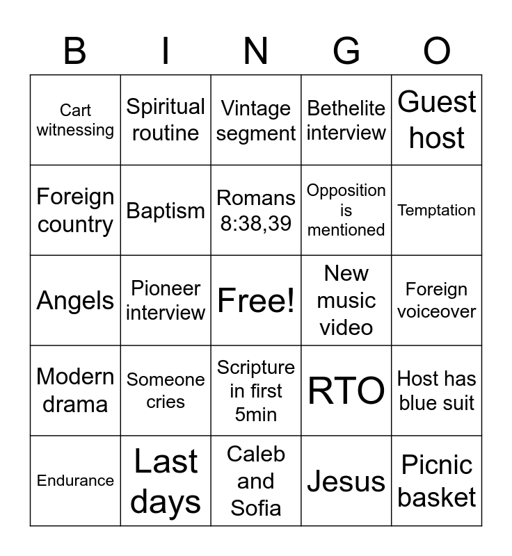 This bingo card has a free space and 37 words: Gillead, SKE, Bethel, Baptism, Host has blue suit, Someone cries, Romans 8:38,39, Child interview, Guest host, Couple interview, Pioneer interview, Bethelite interview, Picnic basket, Foreign voiceover, Foreign country, Modern drama, Bible drama, Vintage segment, Scripture in first 5min, New music video, Cart witnessing, Temptation, Endurance, Caleb and Sofia, Jehovah, Jesus, Spiritual routine, Daily Bible reading, Bow tie, Field ministry, Spiritual darkness, Last days, Angels, The apostles, RTO, Opposition is mentioned and Resurrection.