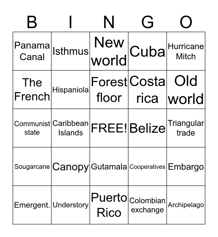 This bingo card has a free space and 24 words: Canopy, Understory, Forest floor, Emergent., Hurricane Mitch, Panama Canal, The French, Isthmus, Belize, Gutamala, Costa rica, Communist state, Cooperatives, Embargo, Hispaniola, Colombian exchange, Triangular trade, New world, Old world, Caribbean Islands, Archipelago, Sougarcane, Cuba and Puerto Rico.