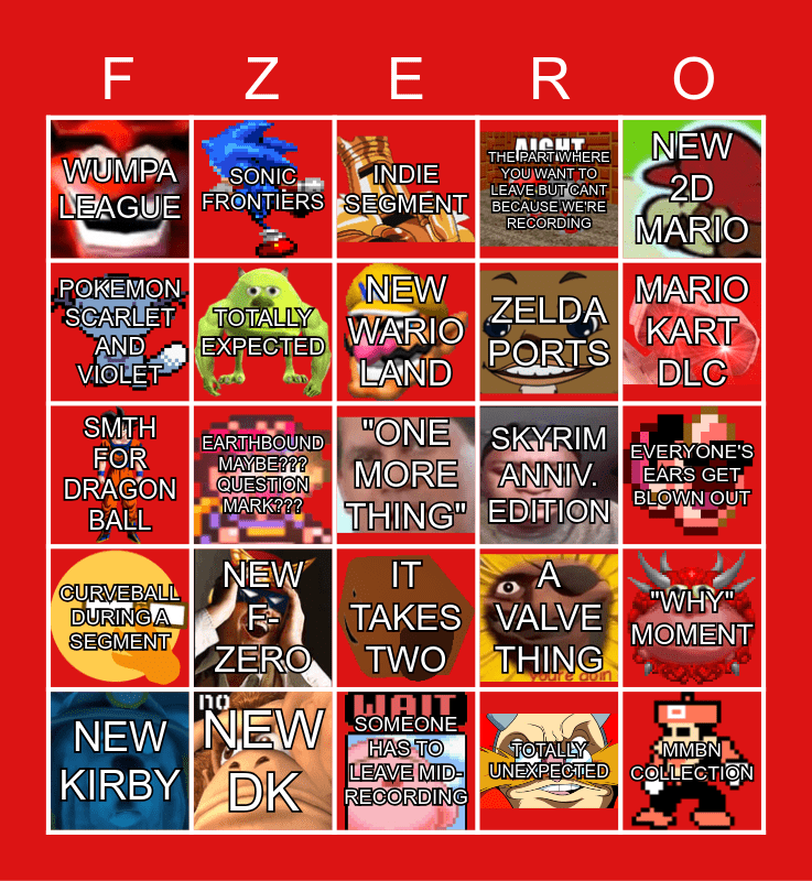 This bingo card has 24 images, a free space and 24 words: NEW F-ZERO, NEW DK, NEW WARIO LAND, NEW KIRBY, NEW 2D MARIO, WUMPA LEAGUE, POKEMON SCARLET AND VIOLET, SONIC FRONTIERS, SKYRIM ANNIV. EDITION, IT TAKES TWO, ZELDA PORTS, SMTH FOR DRAGON BALL, A VALVE THING, "WHY" MOMENT, TOTALLY EXPECTED, TOTALLY UNEXPECTED, EVERYONE'S EARS GET BLOWN OUT, INDIE SEGMENT, MARIO KART DLC, EARTHBOUND MAYBE??? QUESTION MARK???, MMBN COLLECTION, CURVEBALL DURING A SEGMENT, THE PART WHERE YOU WANT TO LEAVE BUT CANT BECAUSE WE'RE RECORDING and SOMEONE HAS TO LEAVE MID-RECORDING.