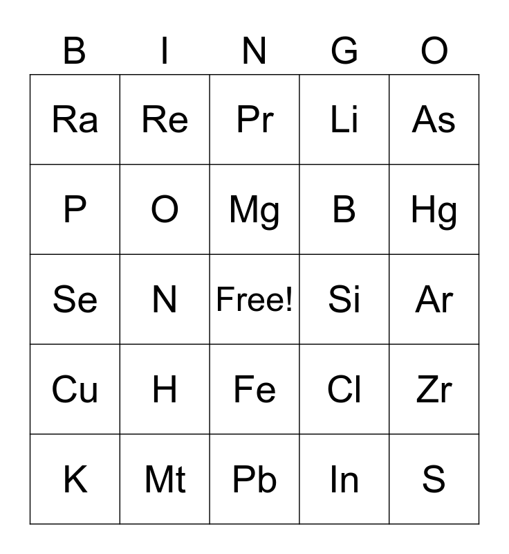 This bingo card has a free space and 39 words: Na, Ag, C, O, K, Fe, Mg, Ne, As, Cu, N, Li, S, Ar, Si, H, Pt, Ra, Al, Cl, P, Pb, B, Hg, Ga, Lv, Eu, U, Cr, Re, W, Hf, Pr, Mt, In, Cm, Zr, Se and I.