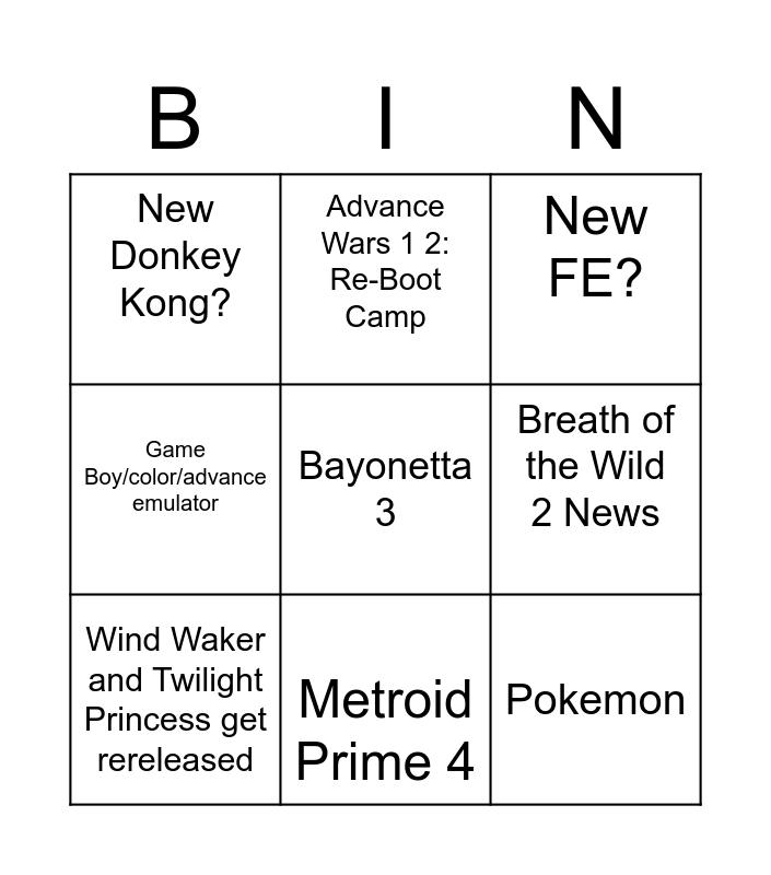 This bingo card has a free space and 8 words: Game Boy/color/advance emulator, Advance Wars 1 2: Re-Boot Camp, Breath of the Wild 2 News, Wind Waker and Twilight Princess get rereleased, New FE?, New Donkey Kong?, Metroid Prime 4 and Pokemon.