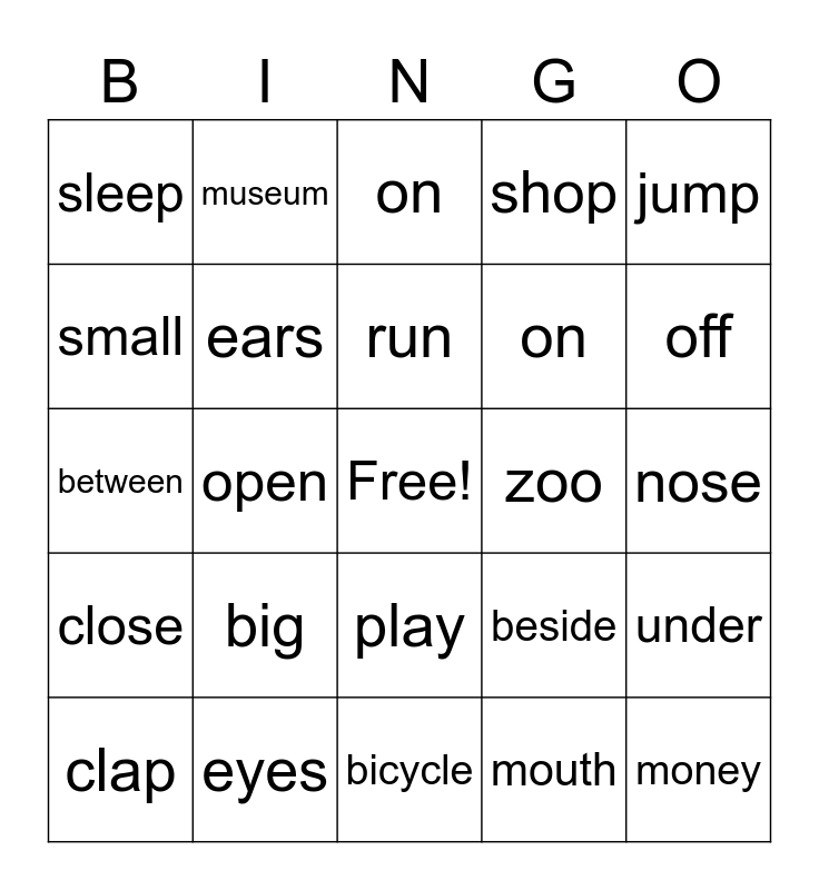 This bingo card has a free space and 24 words: big, eyes, run, clap, jump, sleep, small, museum, zoo, play, on, between, beside, under, ears, mouth, nose, on, off, open, money, close, shop and bicycle.