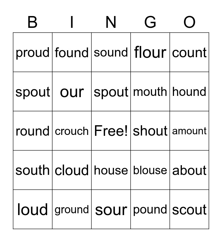 This bingo card has a free space and 24 words: cloud, ground, spout, loud, count, proud, spout, found, shout, house, mouth, round, blouse, about, our, pound, amount, sound, hound, crouch, scout, south, flour and sour.
