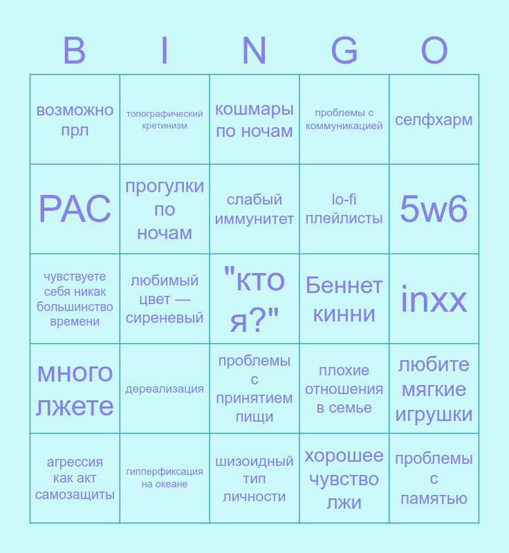This bingo card has a free space and 24 words: агрессия как акт самозащиты, дереализация, слабый иммунитет, хорошее чувство лжи, селфхарм, возможно прл, топографический кретинизм, кошмары по ночам, Беннет кинни, inxx, чувствуете себя никак большинство времени, прогулки по ночам, плохие отношения в семье, любите мягкие игрушки, РАС, гипперфиксация на океане, шизоидный тип личности, проблемы с коммуникацией, 5w6, много лжете, любимый цвет — сиреневый, проблемы с принятием пищи, lo-fi плейлисты and проблемы с памятью.
