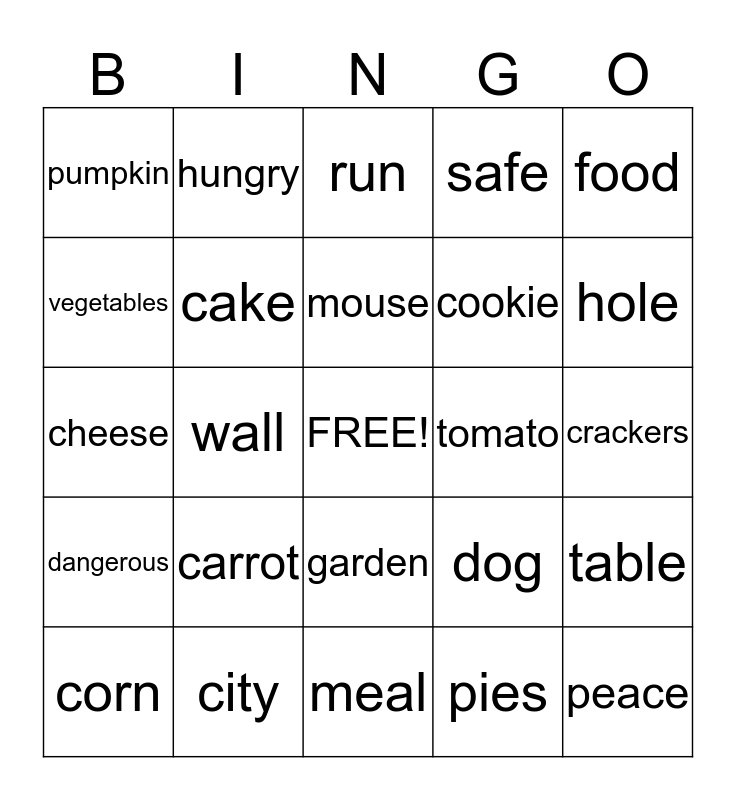 This bingo card has a free space and 24 words: carrot, city, mouse, corn, food, pumpkin, vegetables, hungry, tomato, garden, cookie, cheese, dog, table, cake, pies, crackers, run, hole, wall, peace, dangerous, safe and meal.