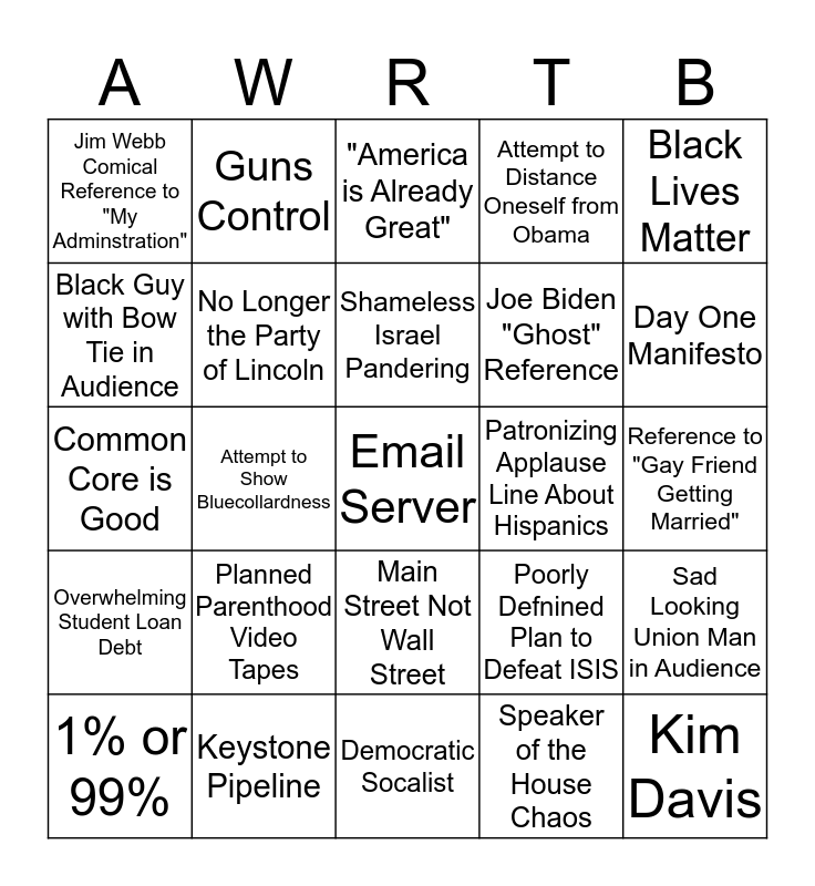 This bingo card has a free space and 24 words: Planned Parenthood Video Tapes, Keystone Pipeline, Shameless Israel Pandering, 1% or 99%, Black Lives Matter, Jim Webb Comical Reference to "My Adminstration", Black Guy with Bow Tie in Audience, Guns Control, Patronizing Applause Line About Hispanics, Main Street Not Wall Street, Joe Biden "Ghost" Reference, Common Core is Good, Poorly Defnined Plan to Defeat ISIS, Sad Looking Union Man in Audience, No Longer the Party of Lincoln, Speaker of the House Chaos, Reference to "Gay Friend Getting Married", "America is Already Great", Day One Manifesto, Attempt to Show Bluecollardness, Kim Davis, Overwhelming Student Loan Debt, Attempt to Distance Oneself from Obama and Democratic Socalist.