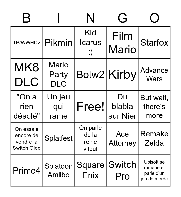This bingo card has a free space and 24 words: Splatfest, Splatoon Amiibo, Botw2, Prime4, Starfox, TP/WWHD2, MK8 DLC, Pikmin, Du blabla sur Nier, On parle de la reine viteuf, Kirby, "On a rien désolé", Ace Attorney, Remake Zelda, Mario Party DLC, Switch Pro, But wait, there's more, Kid Icarus :(, Advance Wars, Un jeu qui rame, Ubisoft se ramène et parle d'un jeu de merde, On essaie encore de vendre la Switch Oled, Film Mario and Square Enix.