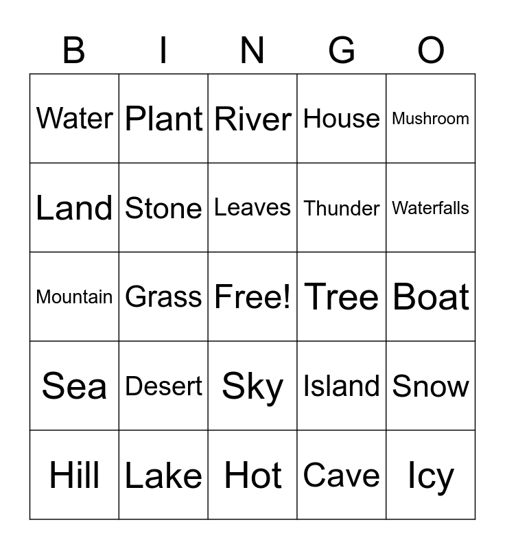 This bingo card has a free space and 24 words: Desert, Lake, Leaves, Hill, Mushroom, Water, Land, Plant, Tree, Sky, Thunder, Mountain, Island, Snow, Stone, Cave, Boat, River, Waterfalls, Grass, Icy, Sea, House and Hot.