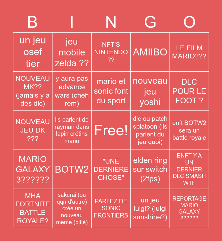 This bingo card has a free space and 24 words: BOTW2, sakurai (ou qqn d'autre) créé un nouveau meme (pitié), mario et sonic font du sport, MHA FORTNITE BATTLE ROYALE?, LE FILM MARIO???, un jeu osef tier, NOUVEAU MK?? (jamais y a des dlc), jeu mobile zelda ??, dlc ou patch splatoon (ils parlent du jeu quoi), "UNE DERNIERE CHOSE", nouveau jeu yoshi, NOUVEAU JEU DK ???, elden ring sur switch (2fps), ENFT Y A UN DERNIER DLC SMASH WTF, y aura pas advance wars (cheh rem), un jeu luigi? (luigi sunshine?), enft BOTW2 sera un battle royale, NFT'S NINTENDO ??, DLC POUR LE FOOT ?, ils parlent de rayman dans lapin crétins mario, REPORTAGE MARIO GALAXY 2?????, MARIO GALAXY 3??????, AMIIBO and PARLEZ DE SONIC FRONTIERS.