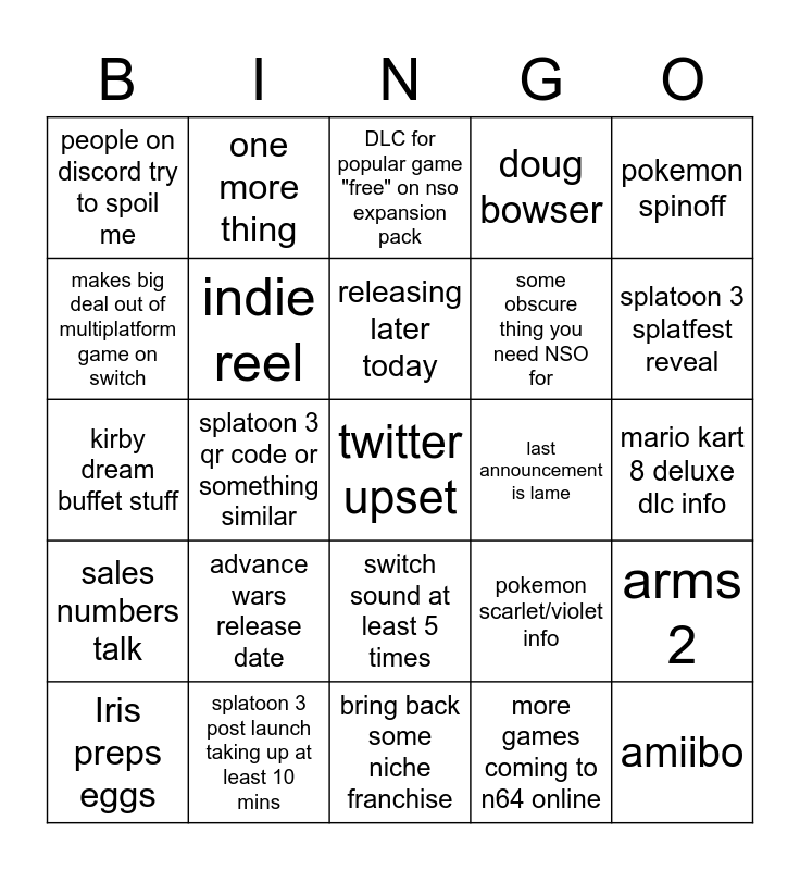 This bingo card has a free space and 24 words: advance wars release date, splatoon 3 post launch taking up at least 10 mins, releasing later today, Iris preps eggs, pokemon spinoff, people on discord try to spoil me, makes big deal out of multiplatform game on switch, one more thing, last announcement is lame, switch sound at least 5 times, some obscure thing you need NSO for, kirby dream buffet stuff, pokemon scarlet/violet info, arms 2, indie reel, more games coming to n64 online, mario kart 8 deluxe dlc info, DLC for popular game "free" on nso expansion pack, splatoon 3 splatfest reveal, splatoon 3 qr code or something similar, amiibo, sales numbers talk, doug bowser and bring back some niche franchise.