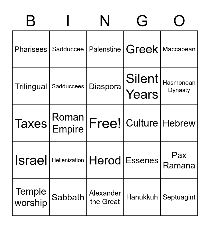 This bingo card has a free space and 24 words: Hellenization, Sabbath, Diaspora, Temple worship, Maccabean, Pharisees, Trilingual, Sadduccee, Culture, Herod, Silent Years, Taxes, Essenes, Pax Ramana, Sadduccees, Hanukkuh, Hebrew, Palenstine, Hasmonean Dynasty, Roman Empire, Septuagint, Israel, Greek and Alexander the Great.