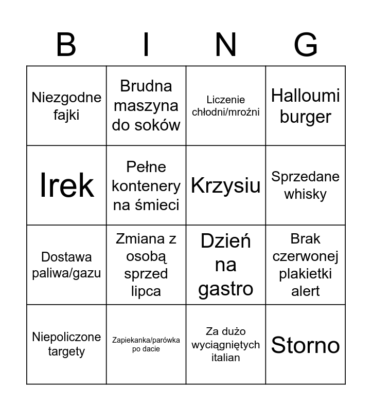 This bingo card has 16 words: Zapiekanka/parówka po dacie, Brak czerwonej plakietki alert, Liczenie chłodni/mroźni, Niezgodne fajki, Dostawa paliwa/gazu, Brudna maszyna do soków, Dzień na gastro, Za dużo wyciągniętych italian, Irek, Pełne kontenery na śmieci, Niepoliczone targety, Halloumi burger, Zmiana z osobą sprzed lipca, Sprzedane whisky, Krzysiu and Storno.