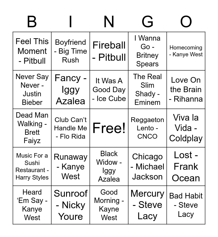 This bingo card has a free space and 30 words: Sunroof - Nicky Youre, Late Night Talking - Harry Styles, Club Can’t Handle Me - Flo Rida, Time of Our Lives - Pitbull, Feel This Moment - Pitbull, Fireball - Pitbull, Fancy - Iggy Azalea, Black Widow - Iggy Azalea, Reggaeton Lento - CNCO, Good Morning - Kayne West, Viva la Vida - Coldplay, Bad Habit - Steve Lacy, Mercury - Steve Lacy, Love Story - Taylor Swift, Love On the Brain - Rihanna, Where Have You Been - Rihanna, Chicago - Michael Jackson, Music For a Sushi Restaurant - Harry Styles, Runaway - Kanye West, Homecoming - Kanye West, Dead Man Walking - Brett Faiyz, Cigarette Daydreams - Cage The Elephant, Boyfriend - Big Time Rush, The Real Slim Shady - Eminem, Never Say Never - Justin Bieber, I Wanna Go - Britney Spears, Lost - Frank Ocean, Heard ‘Em Say - Kanye West, It Was A Good Day - Ice Cube and On The Floor - Jennifer Lopez.
