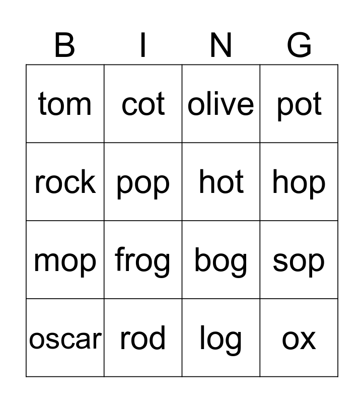 This bingo card has a free space and 15 words: oscar, ox, olive, tom, hop, rock, frog, log, pop, mop, sop, pot, hot, cot and rod.