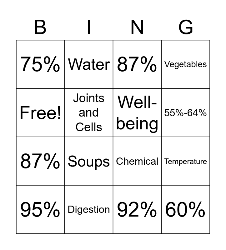 This bingo card has 16 words: Digestion, Temperature, 87%, 75%, 87%, Water, Chemical, 92%, Free!, Joints and Cells, 95%, Vegetables, Soups, 55%-64%, Well-being and 60%.