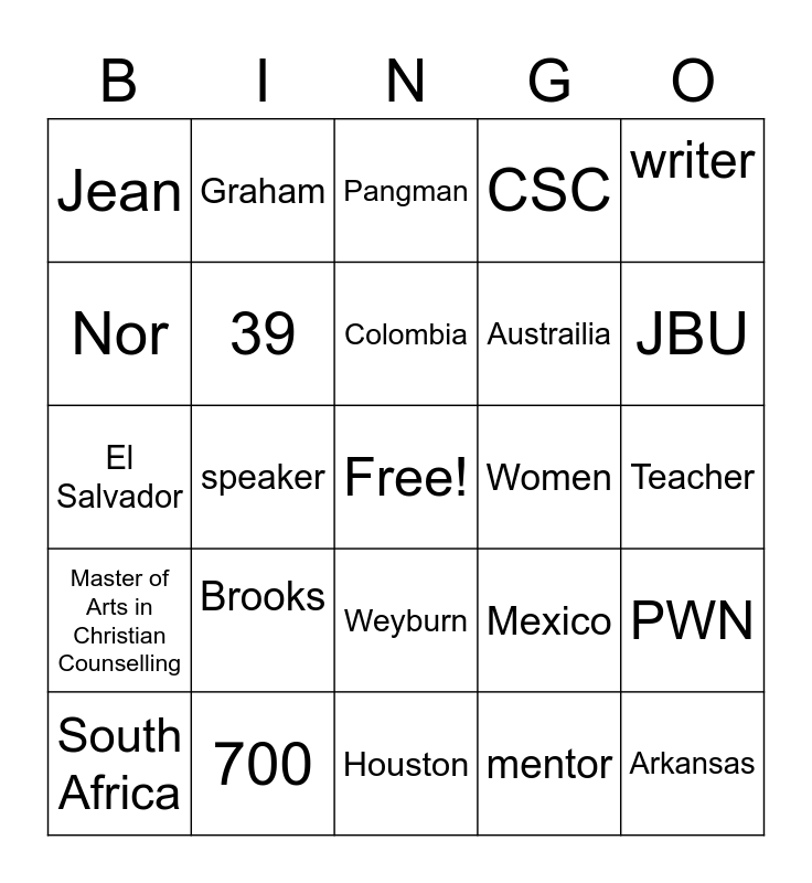 This bingo card has a free space and 50 words: Siloam Springs, Arkansas, Edgemont, Houston, Brooks, Nordan, Graham, Janette, Nor, Norlee, 39, CSC, PWN, Mexico, Cuba, India, Colombia, Women, 2, writer, speaker, mentor, Jean, Austrailia, Biking, Kayak, JBU, Denver, Pangman, Weyburn, Calgary, Sheppard, April 14, Red, 700, Relationships, Workplace, Roses, Cooking, Teacher, 3, OIC, IJM, fundraiser, South Africa, El Salvador, sanguine, B of E, Master of Arts in Christian Counselling and Faith.