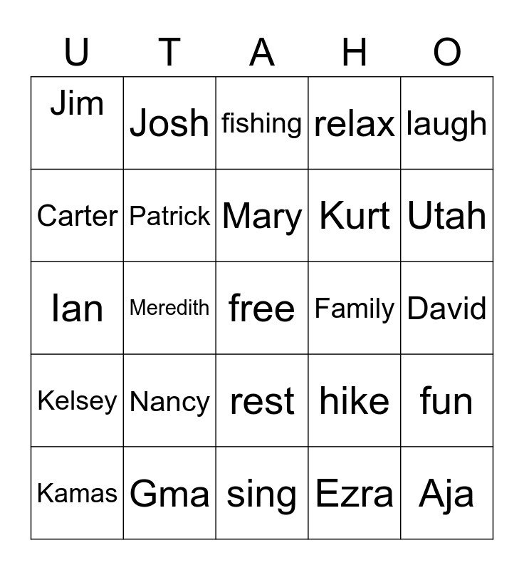 This bingo card has a free space and 24 words: Nancy, Gma, Mary, Kamas, laugh, Jim, Carter, Josh, Family, rest, Kurt, Ian, hike, fun, Patrick, Ezra, David, fishing, Utah, Meredith, Aja, Kelsey, relax and sing.