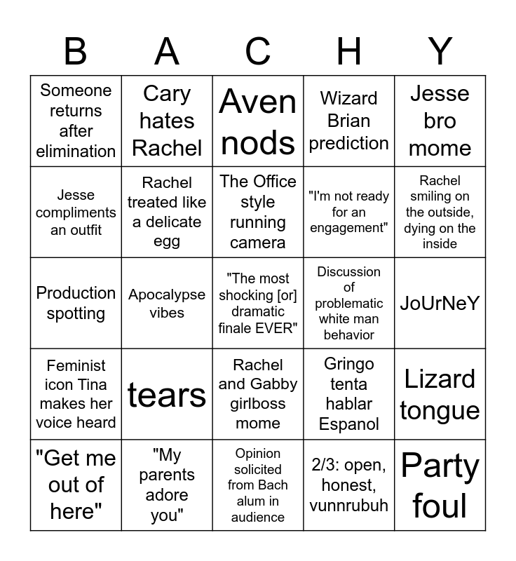 This bingo card has a free space and 24 words: tears, "My parents adore you", The Office style running camera, "Get me out of here", Jesse bro mome, Someone returns after elimination, Jesse compliments an outfit, Cary hates Rachel, Discussion of problematic white man behavior, Rachel and Gabby girlboss mome, "I'm not ready for an engagement", Production spotting, Gringo tenta hablar Espanol, Lizard tongue, Rachel treated like a delicate egg, 2/3: open, honest, vunnrubuh, JoUrNeY, Aven nods, Rachel smiling on the outside, dying on the inside, Apocalypse vibes, Party foul, Feminist icon Tina makes her voice heard, Wizard Brian prediction and Opinion solicited from Bach alum in audience.