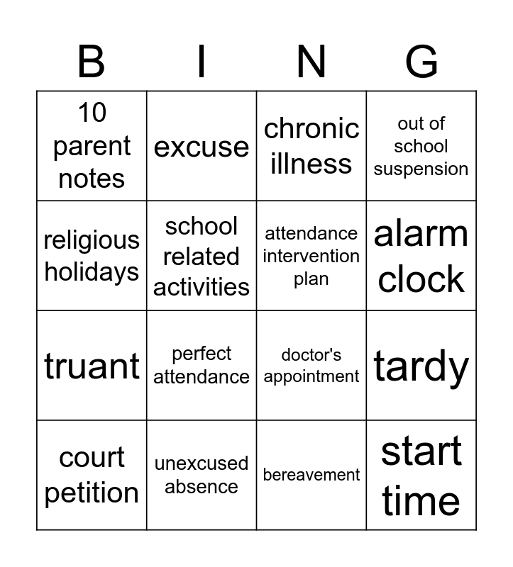 This bingo card has 16 words: unexcused absence, tardy, chronic illness, 10 parent notes, truant, excuse, doctor's appointment, bereavement, religious holidays, school related activities, court petition, out of school suspension, perfect attendance, alarm clock, attendance intervention plan and start time.