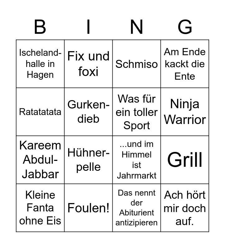 This bingo card has 16 words: Foulen!, Grill, Schmiso, Ischeland- halle in Hagen, Kareem Abdul-Jabbar, Fix und foxi, ...und im Himmel ist Jahrmarkt, Das nennt der Abiturient antizipieren, Ratatatata, Gurken-dieb, Kleine Fanta ohne Eis, Am Ende kackt die Ente, Hühner-pelle, Ninja Warrior, Was für ein toller Sport and Ach hört mir doch auf..