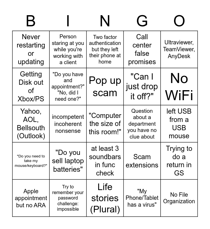 This bingo card has 34 words: No File Organization, "My Phone/Tablet has a virus", "Do you guys fix *Insert highly specific device*?", "They told me it would only take an hour!", "Do you need to take my mouse/keyboard?", "Do you have and appointment?" "No, did I need one?", Ultraviewer, TeamViewer, AnyDesk, Apple appointment but no ARA, Person staring at you while you're working with a client, Windows 7, Pop up scam, Two factor authentication but they left their phone at home, "My computer won't turn on", Printer, Question about a department you have no clue about, No WiFi, Try to remember your password challenge: impossible, Yahoo, AOL, Bellsouth (Outlook), "Do you sell laptop batteries", Scam extensions, at least 3 soundbars in func check, Dustiest, stickiest, most destroyed device you have ever seen, Never restarting or updating, left USB from a USB mouse, Life stories (Plural), "Computer the size of this room!", Call center false promises, "I drove all this way!", "Can I just drop it off?", Getting Disk out of Xbox/PS, Complains about hand sanitizer smell, incompetent incoherent nonsense, Trying to do a return in GS and Carfi.