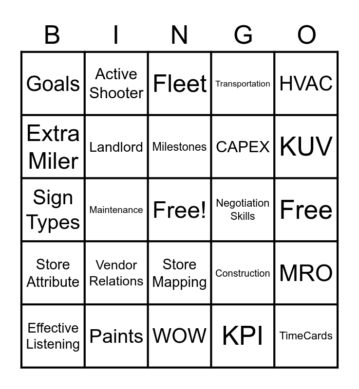 This bingo card has a free space and 35 words: Safety, MM of The Year, Work Order, CAPEX, TimeCards, Goals, Landlord, GSI, Negotiation Skills, Routing, Sign Types, Active Shooter, Store Mapping, Work Life-Fit, HVAC, Store Attribute, Paints, Fleet, KPI, Free, Effective Listening, Maintenance, WOW, NSM 2022, KUV, Extra Miler, Disc, Inventory, Construction, MRO, Winterize, Vendor Relations, Milestones, Transportation and Venstar.