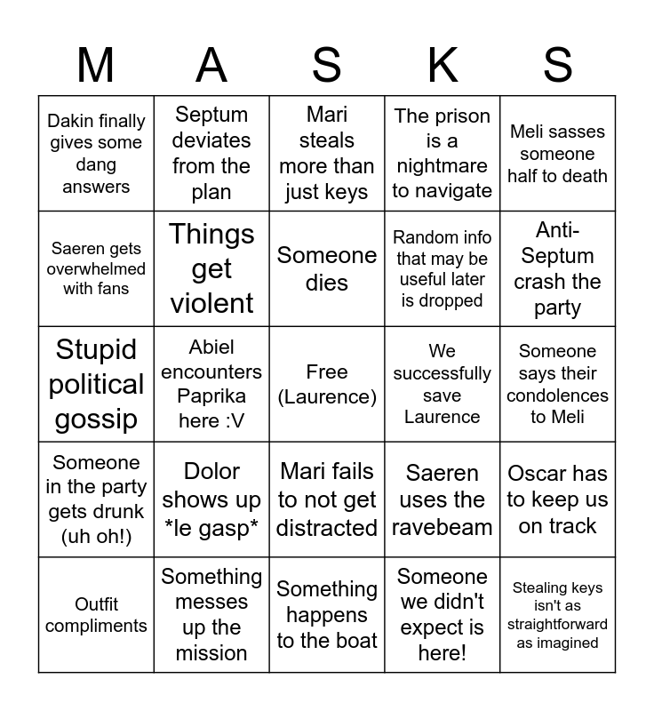 This bingo card has a free space and 24 words: Dolor shows up *le gasp*, Something messes up the mission, Someone dies, Outfit compliments, Meli sasses someone half to death, Dakin finally gives some dang answers, Saeren gets overwhelmed with fans, Septum deviates from the plan, We successfully save Laurence, Mari fails to not get distracted, Random info that may be useful later is dropped, Stupid political gossip, Saeren uses the ravebeam, Oscar has to keep us on track, Things get violent, Someone we didn't expect is here!, Someone says their condolences to Meli, Mari steals more than just keys, Anti-Septum crash the party, Abiel encounters Paprika here :V, Stealing keys isn't as straightforward as imagined, Someone in the party gets drunk (uh oh!), The prison is a nightmare to navigate and Something happens to the boat.
