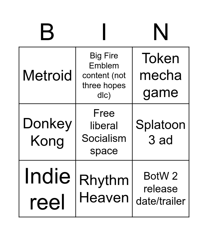 This bingo card has a free space and 8 words: Splatoon 3 ad, Token mecha game, Big Fire Emblem content (not three hopes dlc), Indie reel, Metroid, BotW 2 release date/trailer, Donkey Kong and Rhythm Heaven.